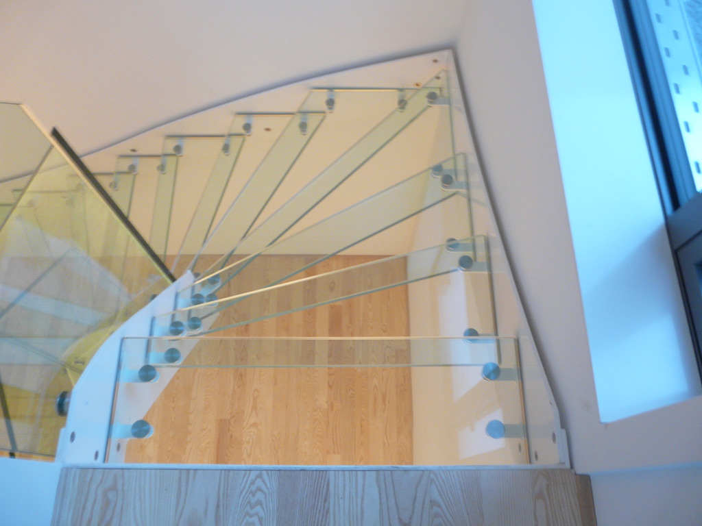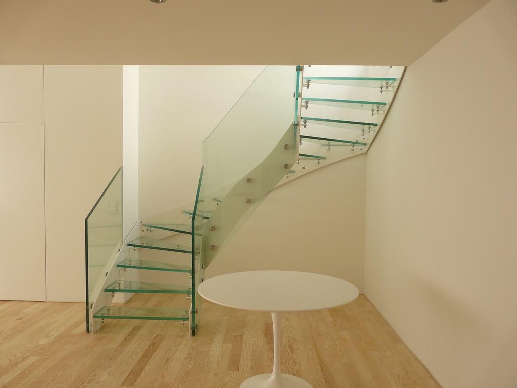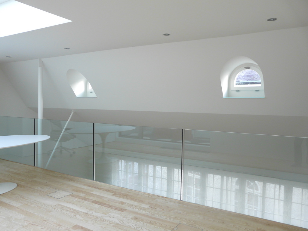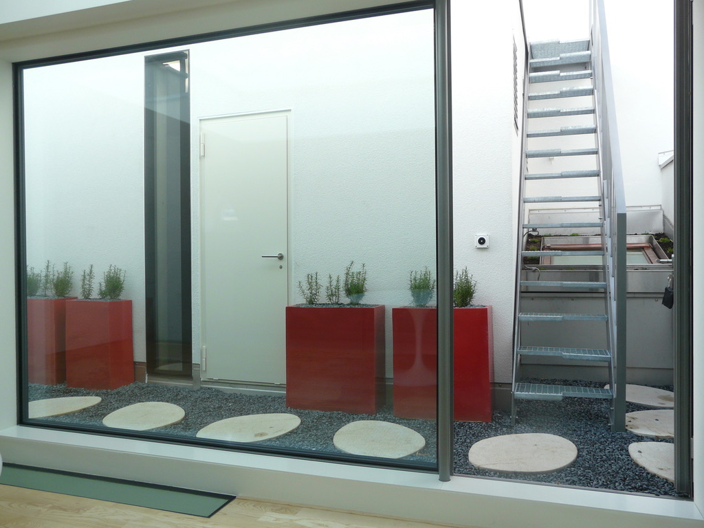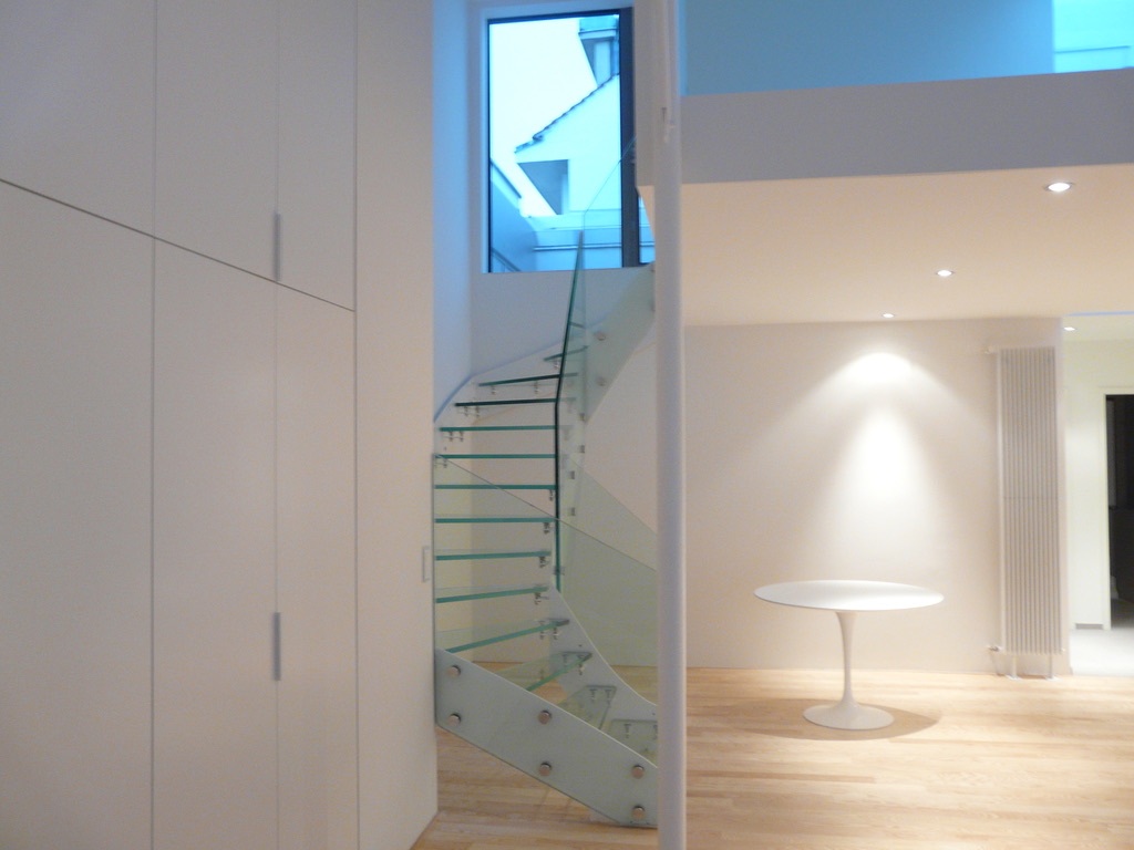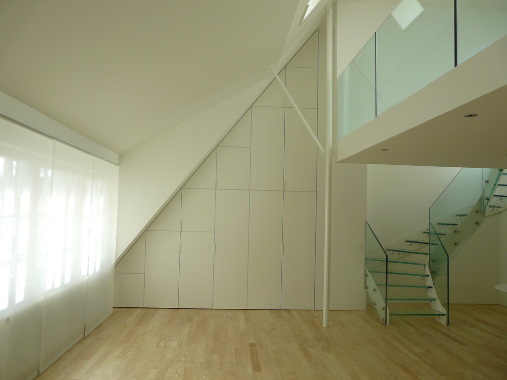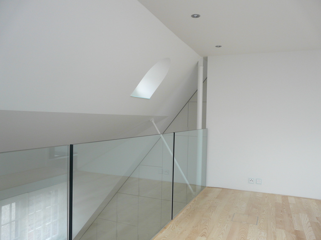 Auf der Galerieebene entstand ein Schlafraum mit Arbeitsplatz und Terrassenzugang. Das Flachdach erhielt ein Fenster aus Isolierglas, das den Lichteinfall bis zur untersten Etage ermöglicht. Eine Glastreppe verbindet die beiden Ebenen.
