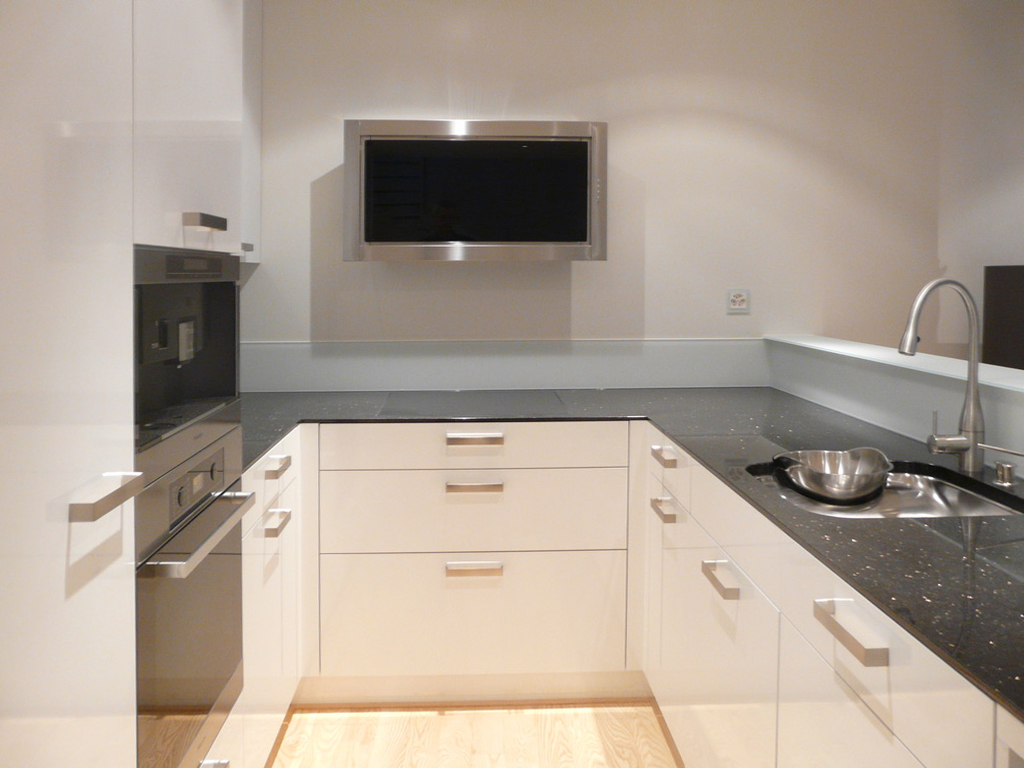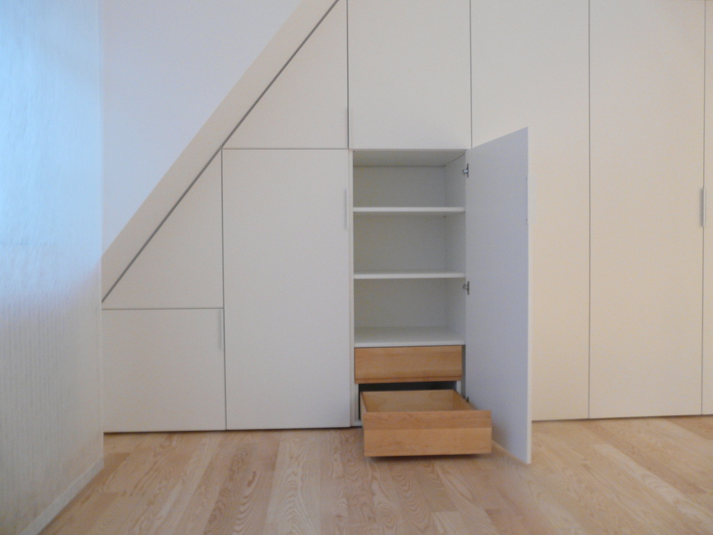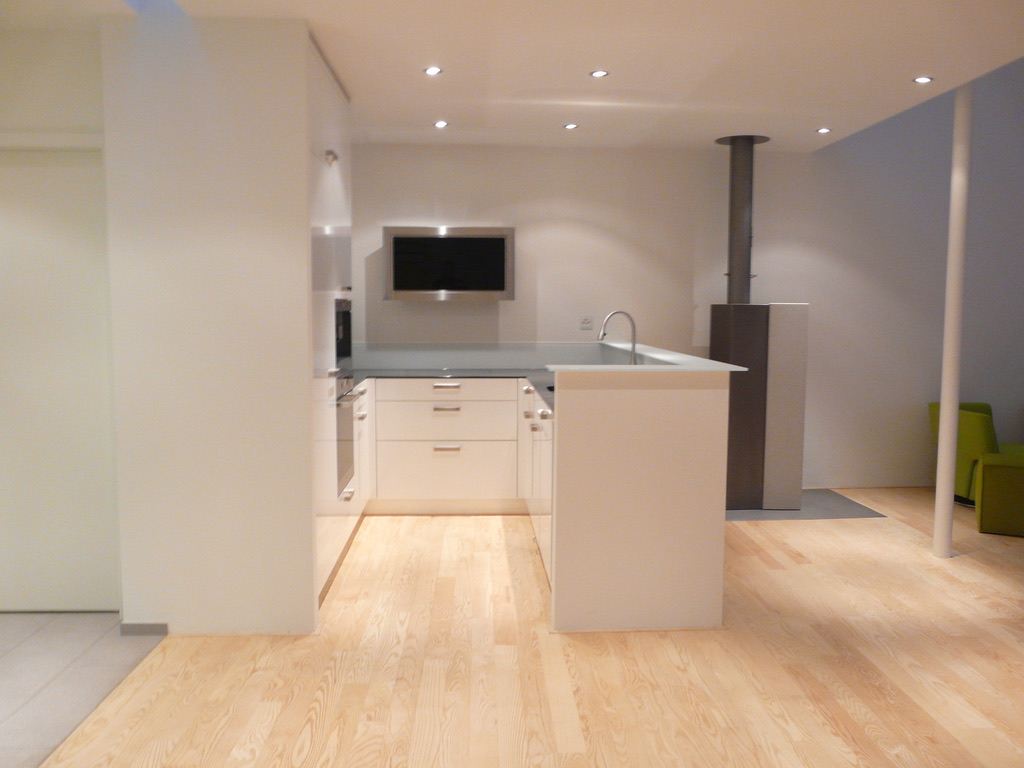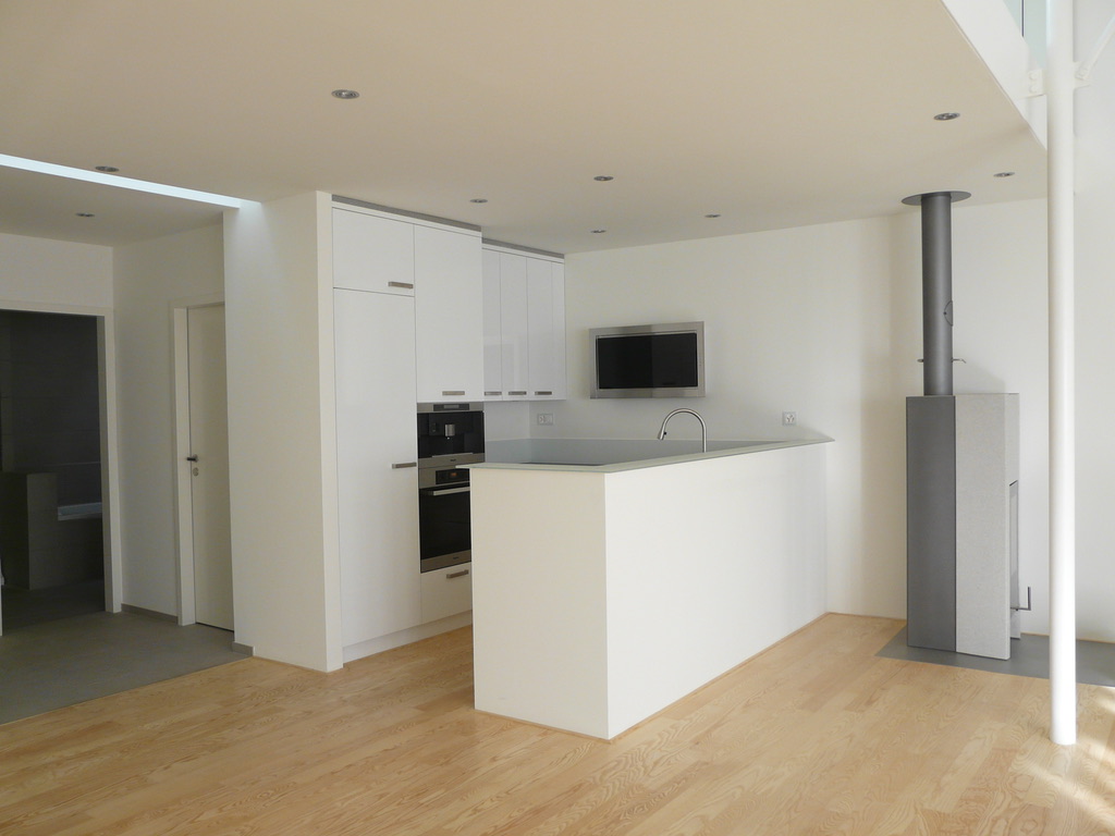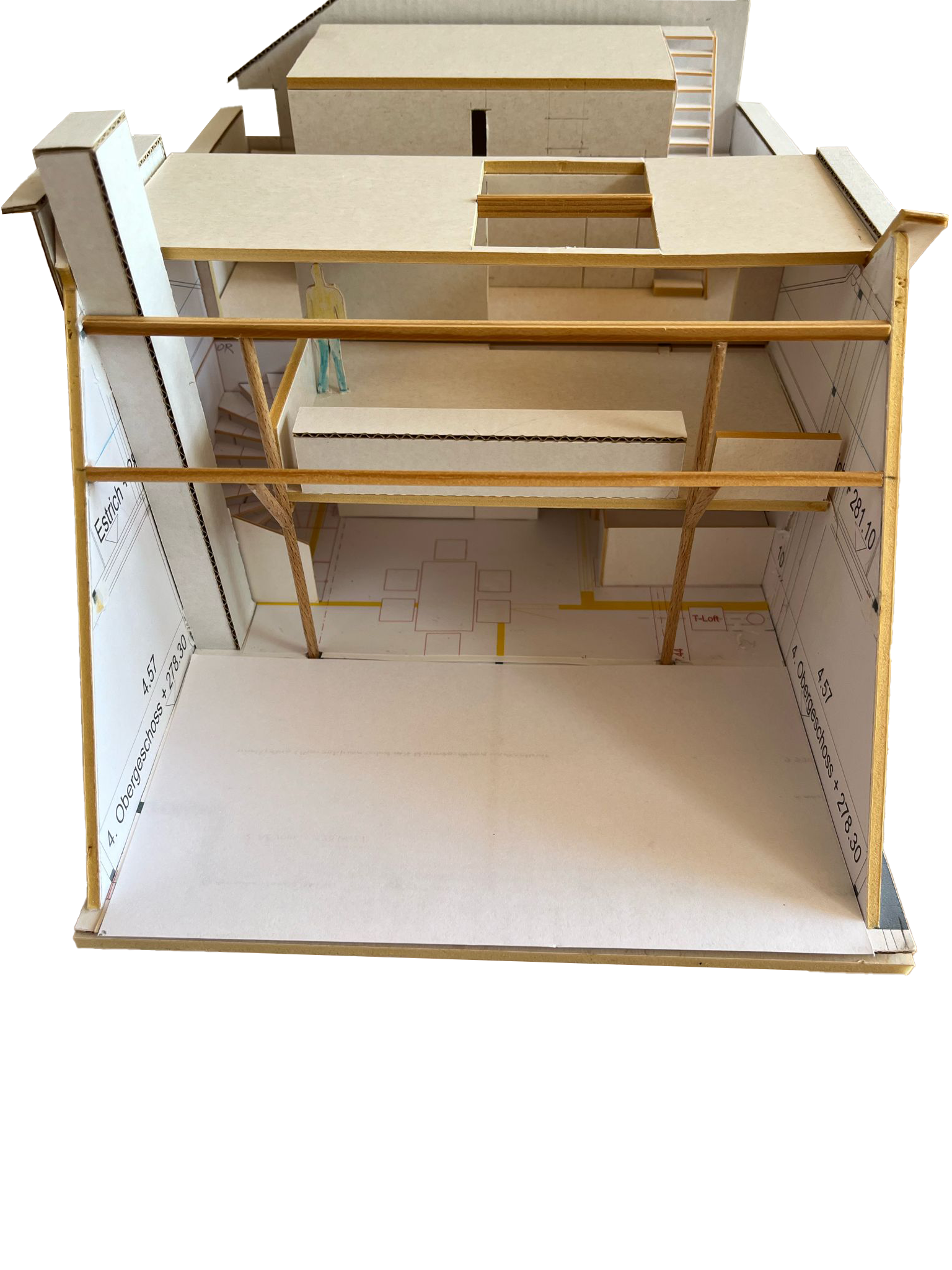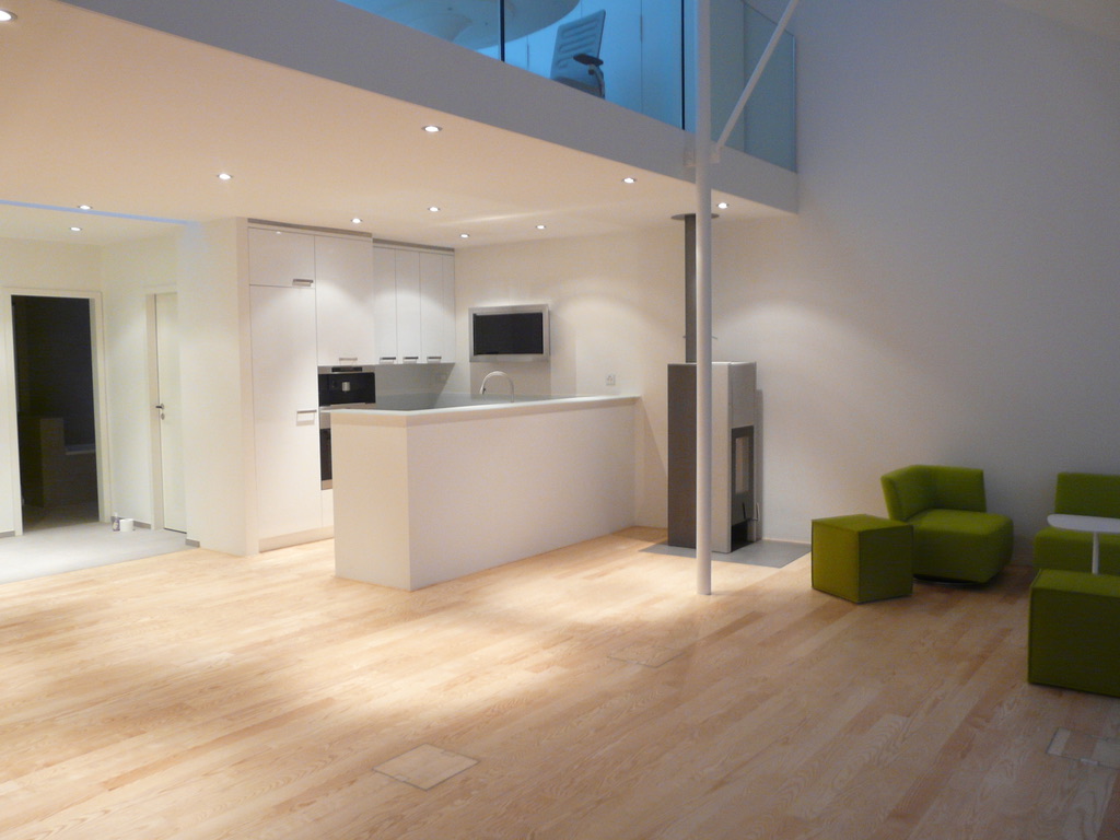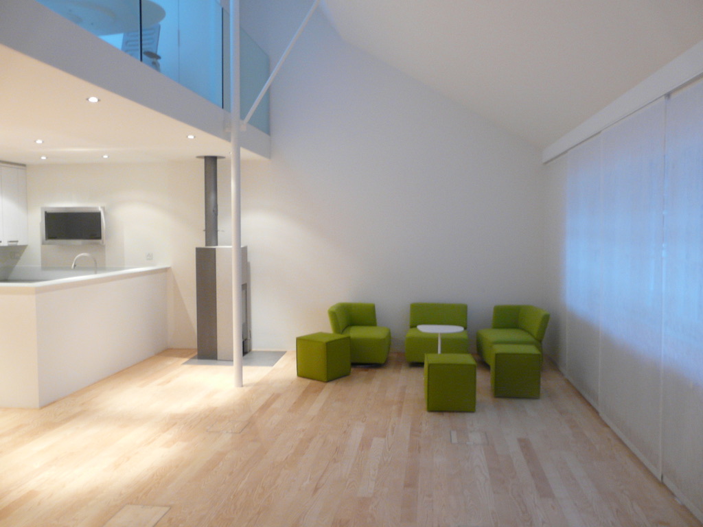Entstanden ist eine offene Raumgestaltung mit einer Galerie als oberster Ebene, so dass ein Übergang der Räume ineinander stattfindet. Im Eingangsgeschoss (4. Ebene) wurden ein offener Wohnraum mit Küche und Esstisch sowie ein Bad eingeplant und realisiert.