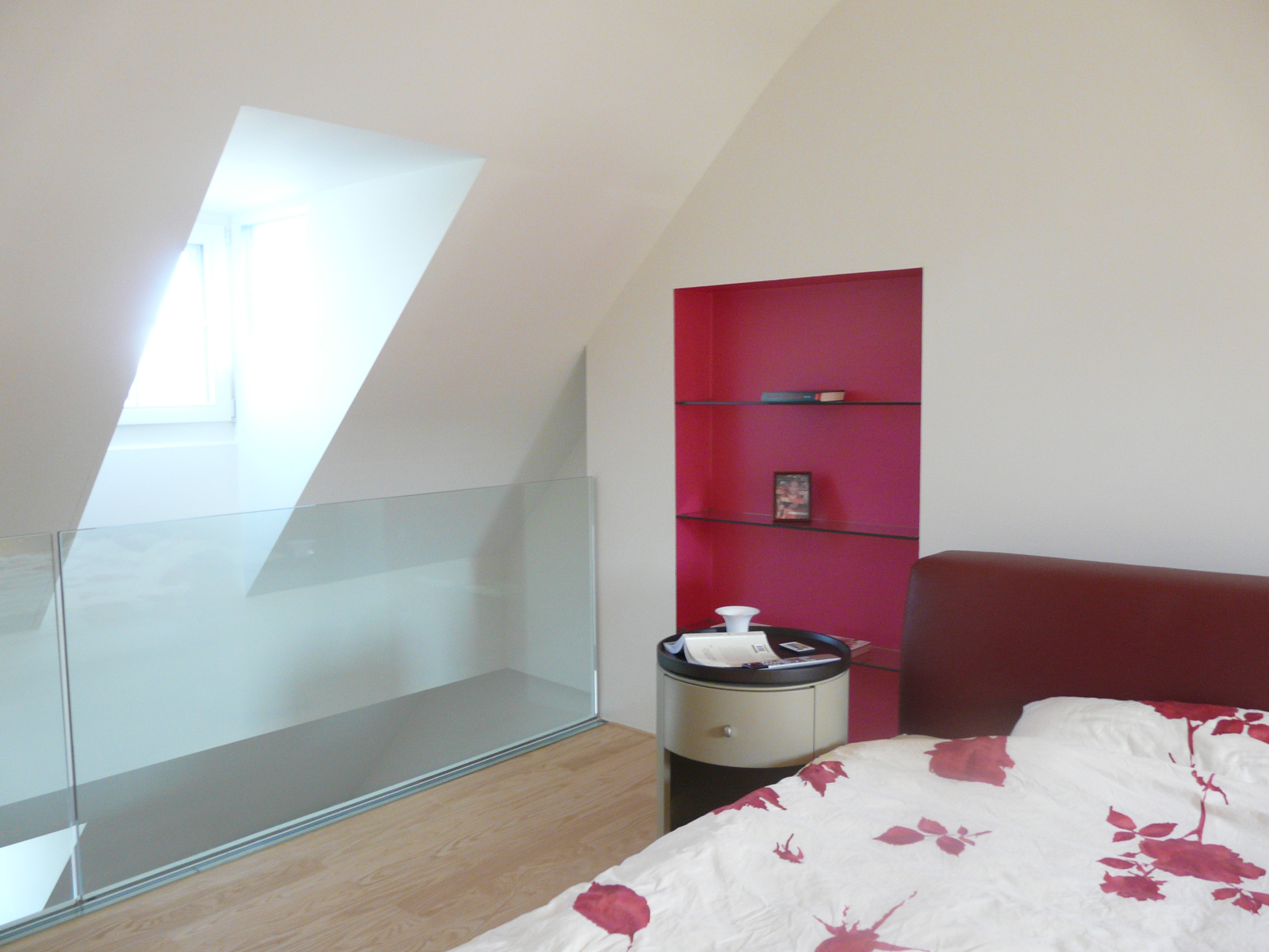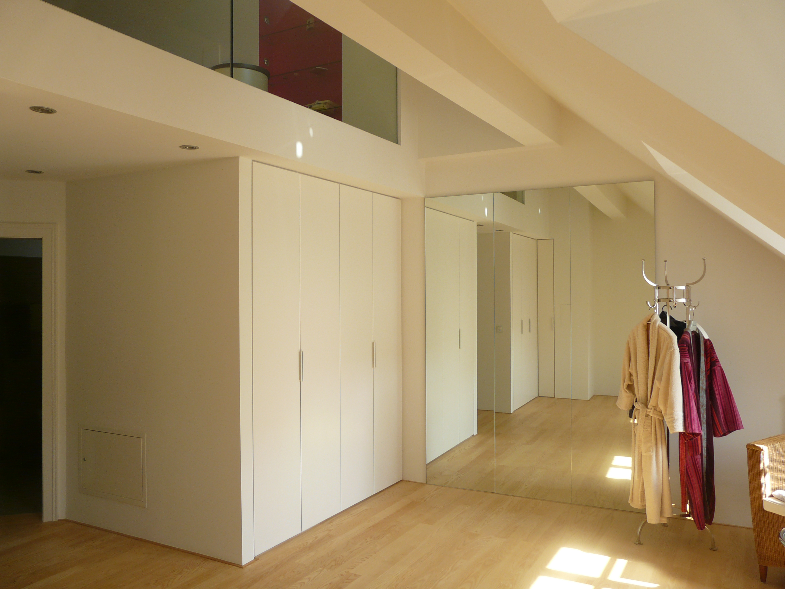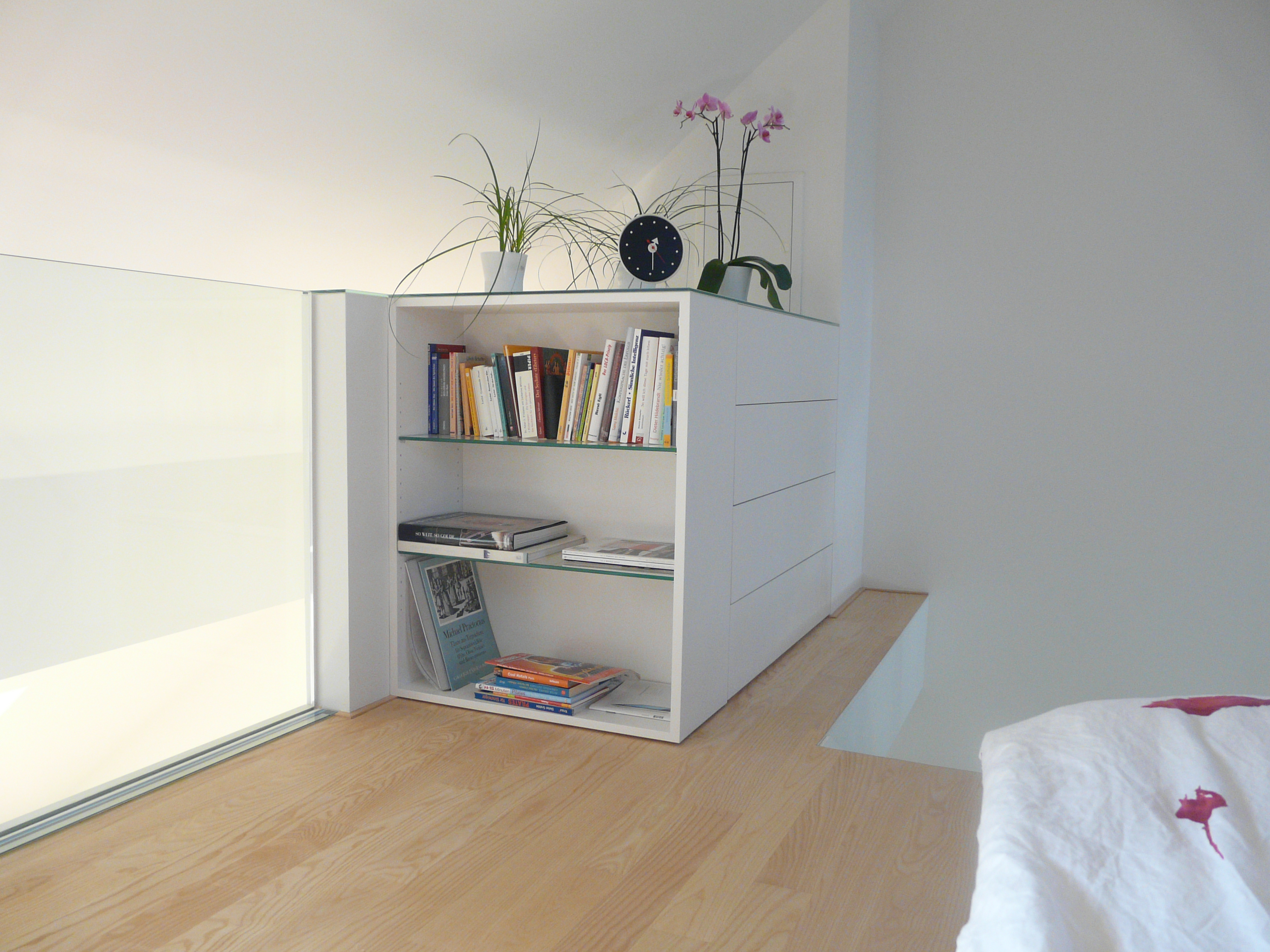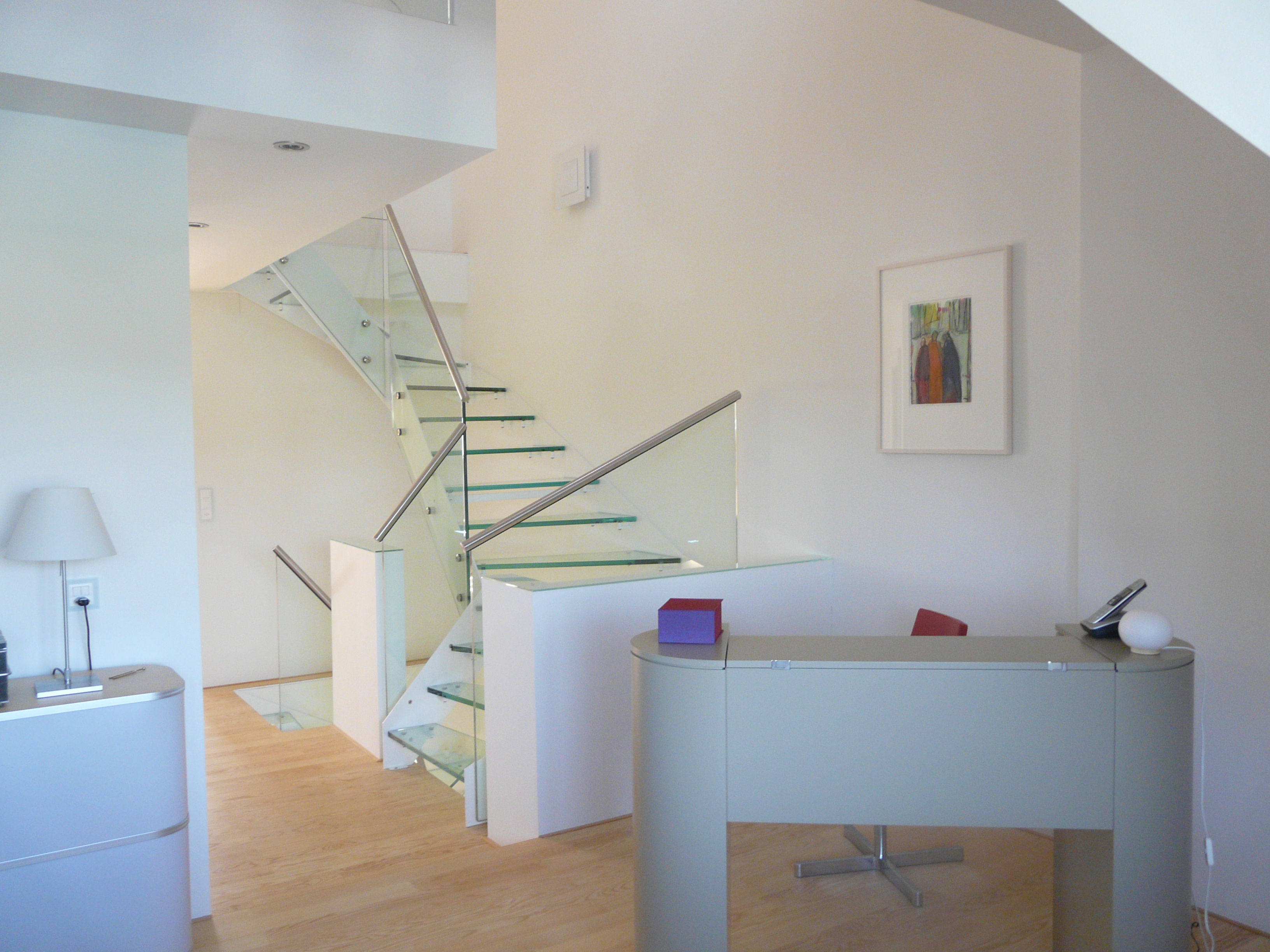 Eine in der Dachetage fast schwebend wirkende Galerie, erlaubt den Blick durch alle Geschosse hindurch, bis hin zur untersten Ebene.