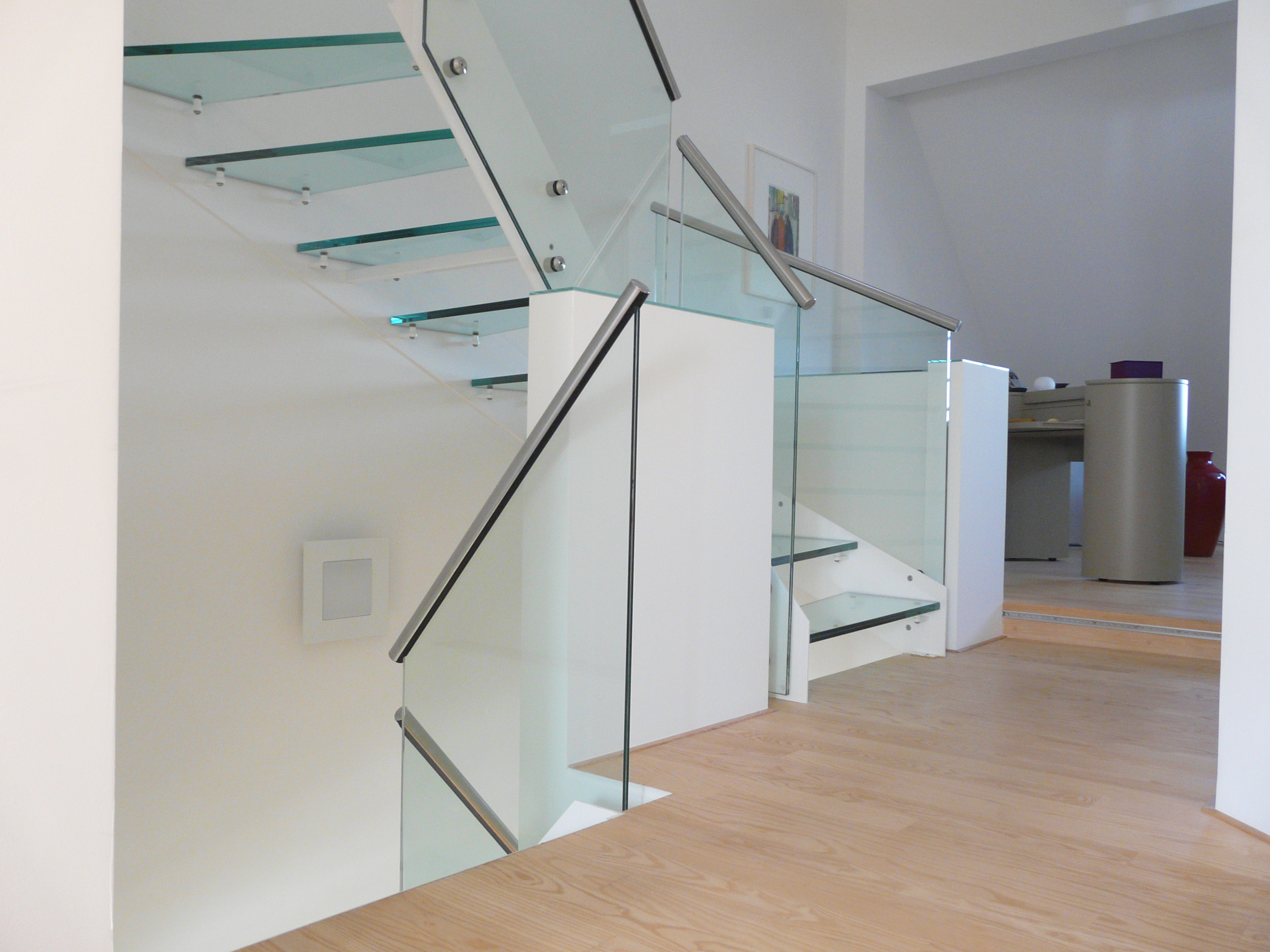 Die Treppen der oberen Etagen wurden mit Glasstufen versehen, um den Lichteinfall der Fenster und Gauben nicht zu unterbrechen und eine natürliche Beleuchtung des Treppenhauses zu gewährleisten.
