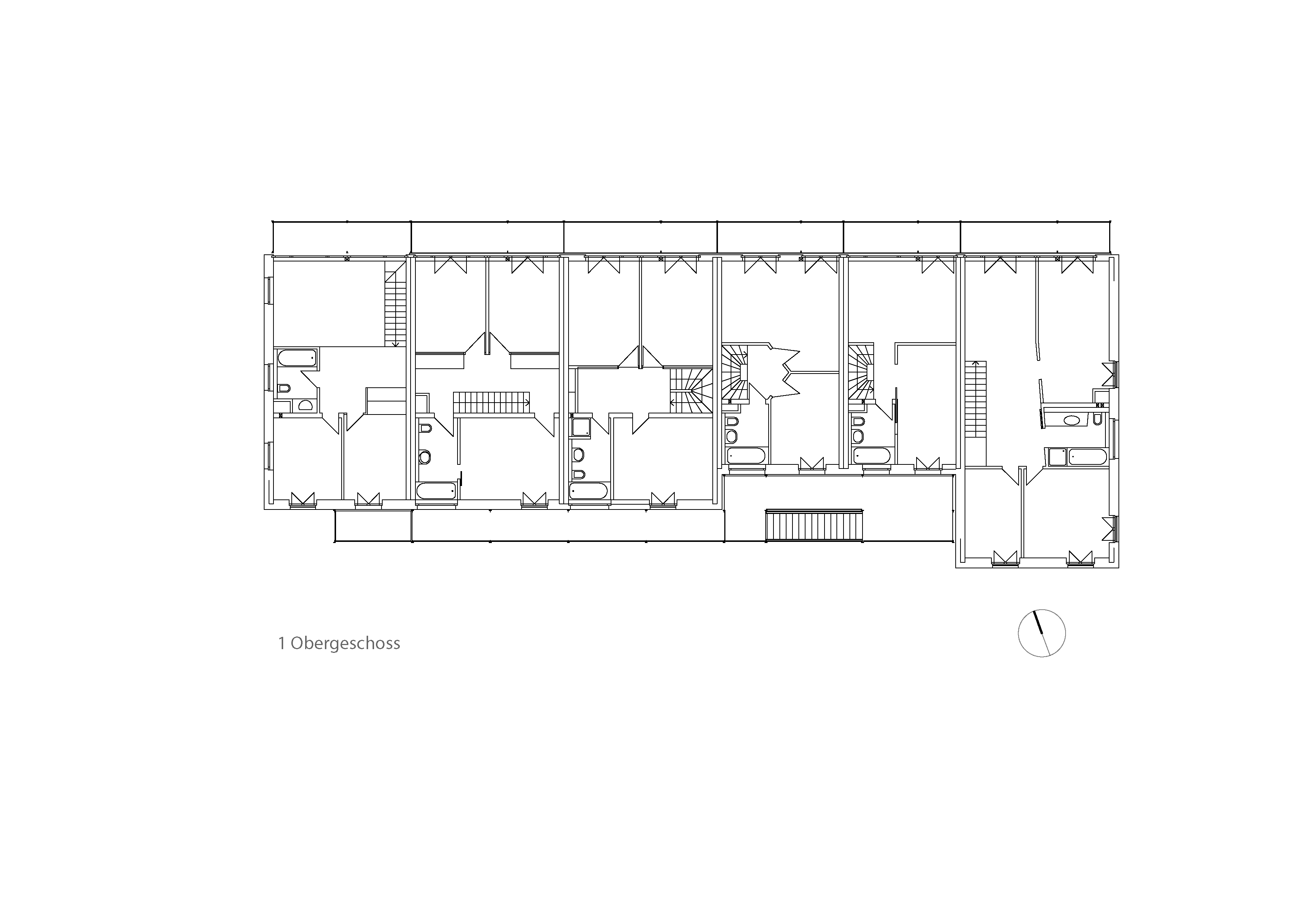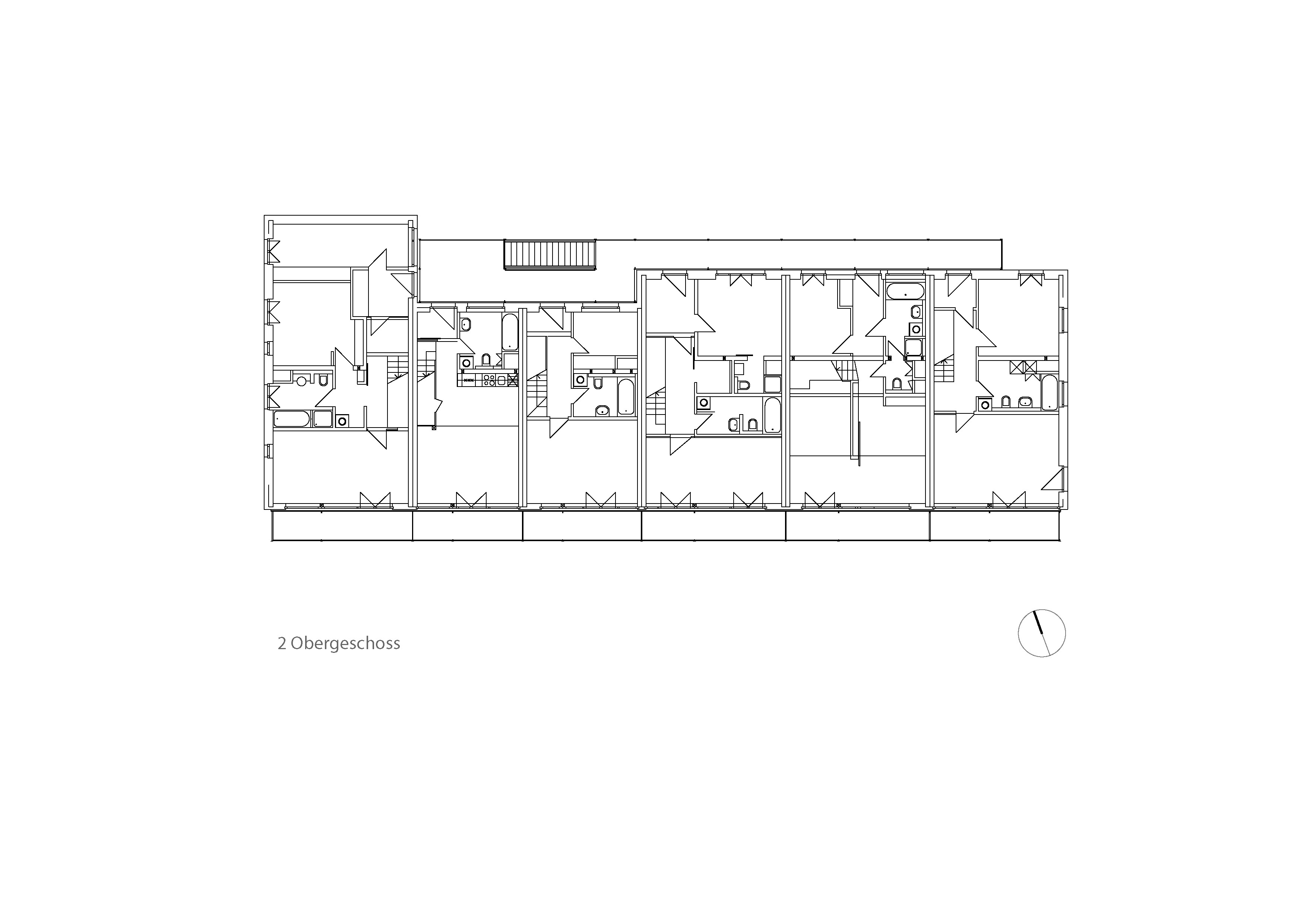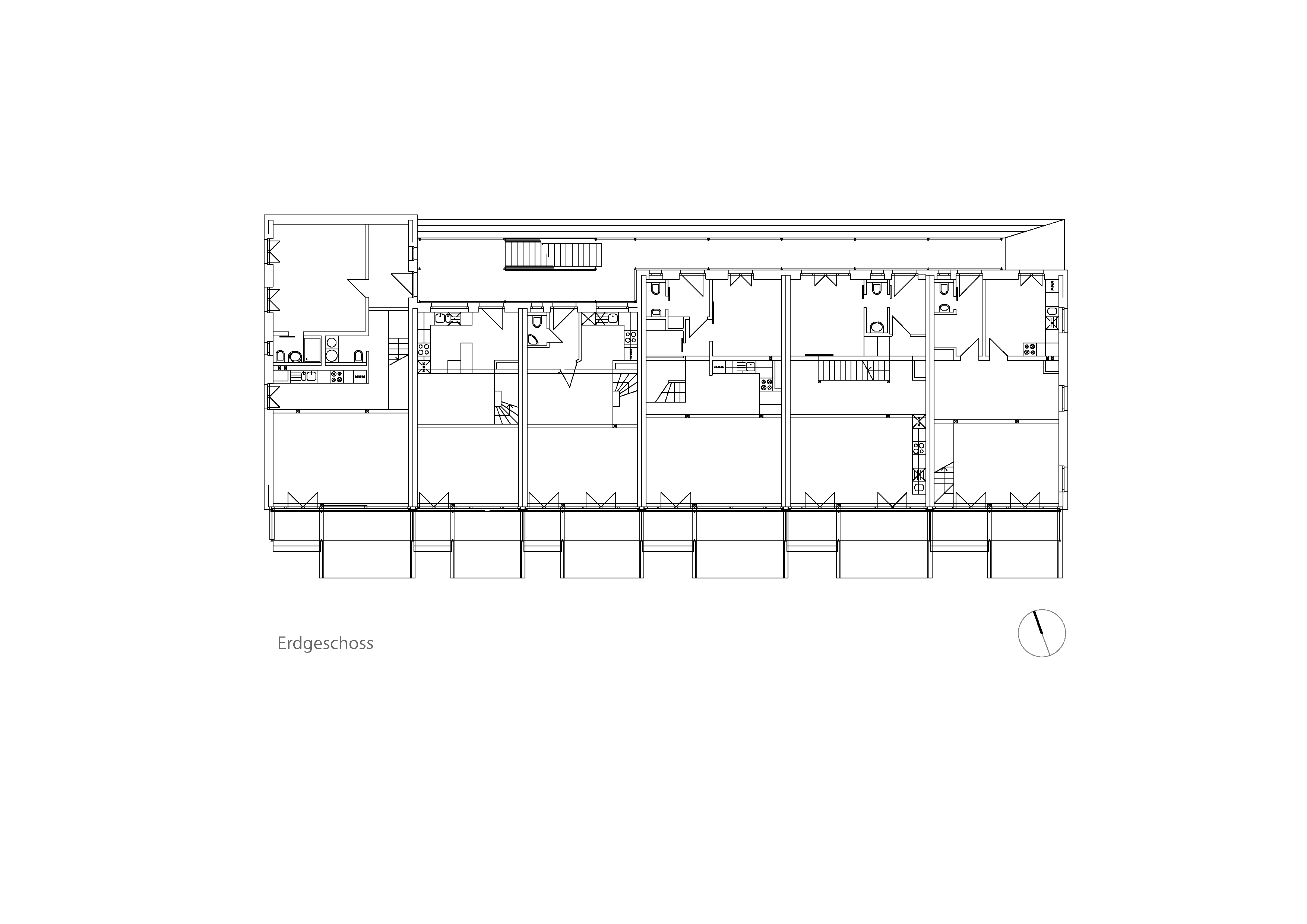Die Erschließung erfolgt über ein gemeinsames offenes Treppenhaus und Laubengänge aus Holz-/Stahlkonstruktion.