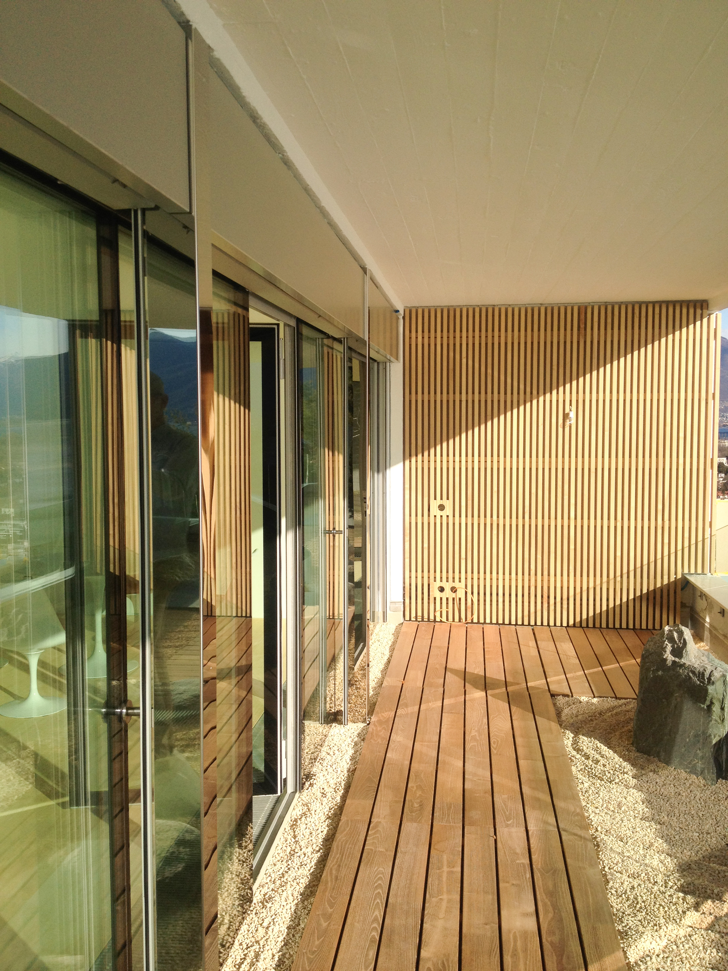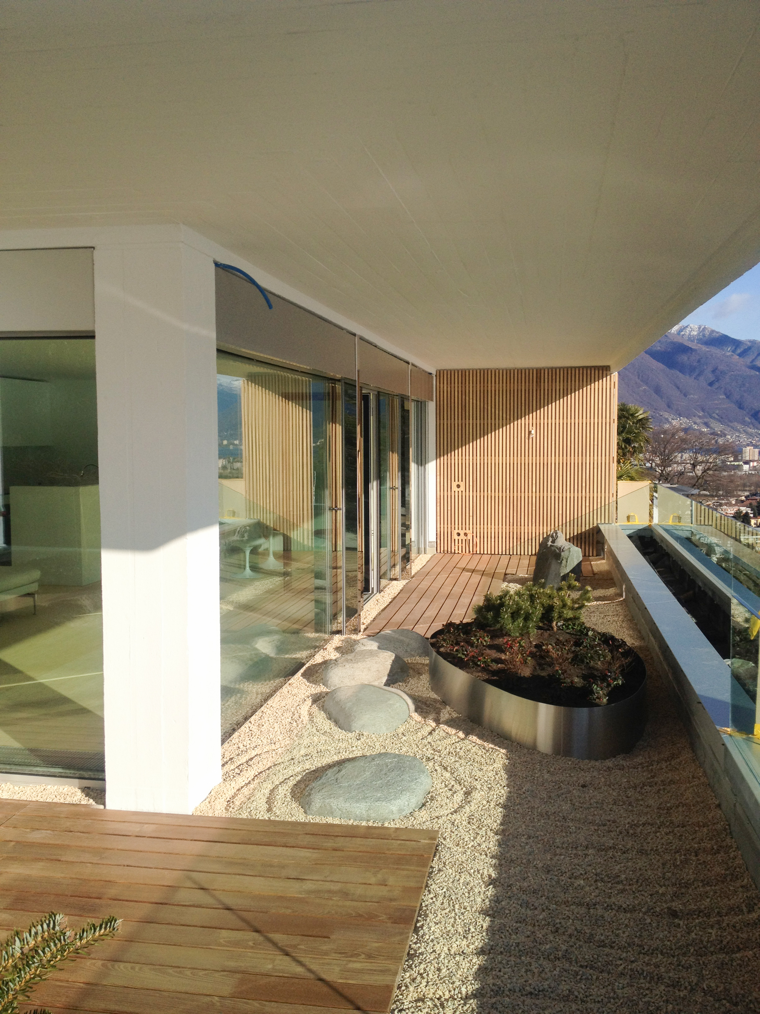 Das Badezimmer erhielt eine Verkleidung aus Tessiner Granit. Sowohl die Ausstattung, als auch die Beleuchtung sind erneuert worden. Filigrane, raumhohe Schiebefenster trennen Wohnraum und Terrasse.