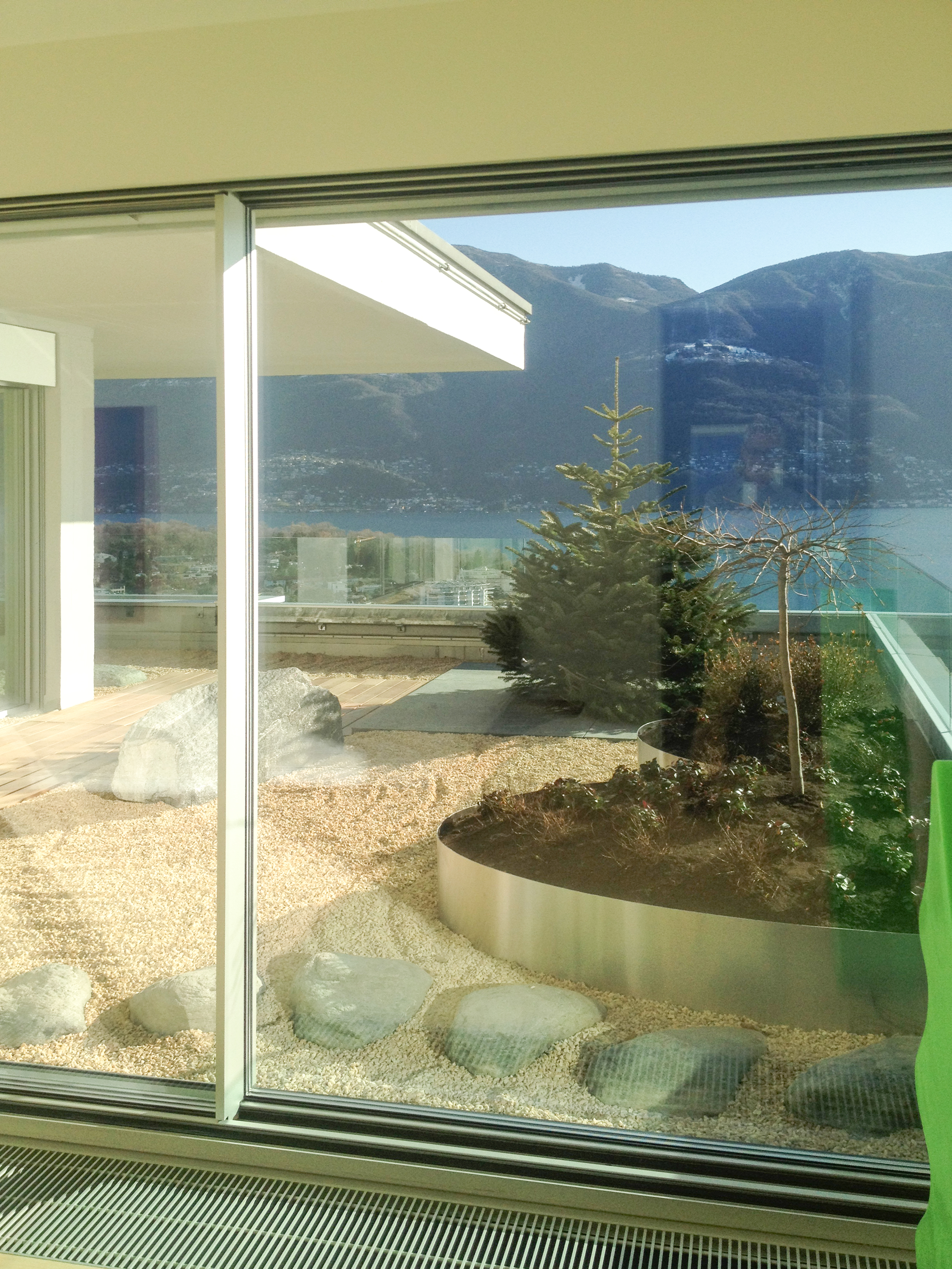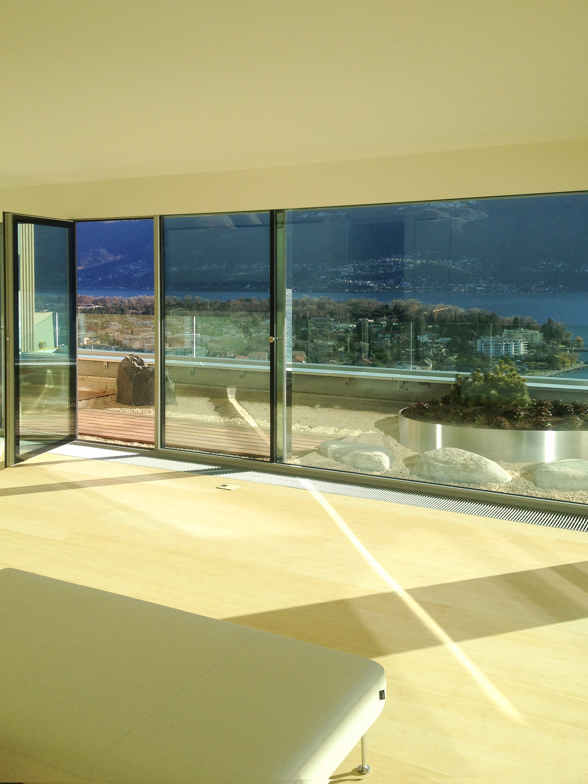 Ein verglaster Öffnungsschlitz zwischen Bade- und Schlafzimmer ermöglicht den direkten Blick auf den Lago Maggiore. Auf diese Weise ist ein ständiger Bezug nach außen möglich.