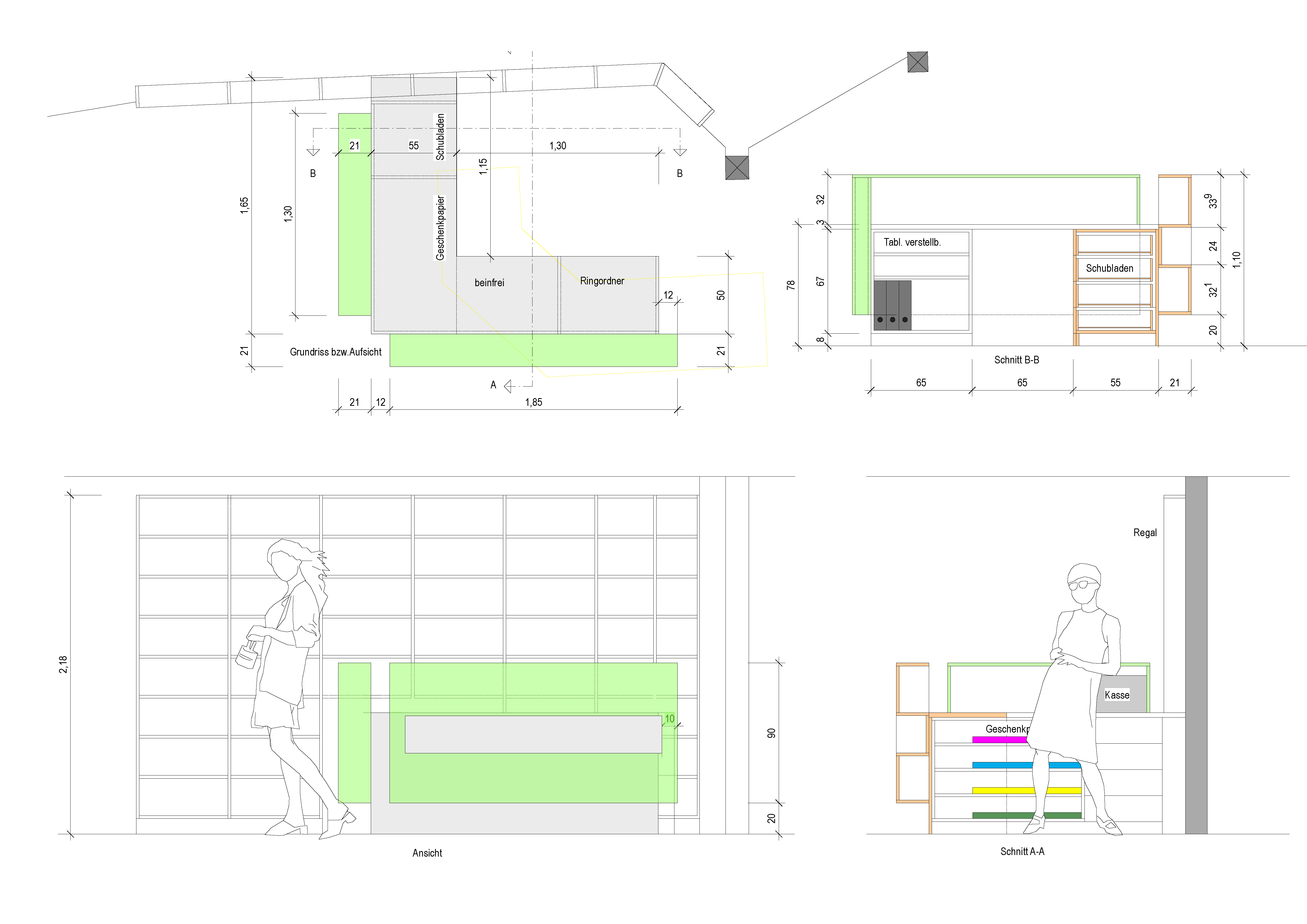 Die Planung beinhaltete Detailzeichnungen inklusive der Buchregale bis zum Maßstab 1:20. Das Ziel war ein einfacher, offener und übersichtlicher Entwurf.