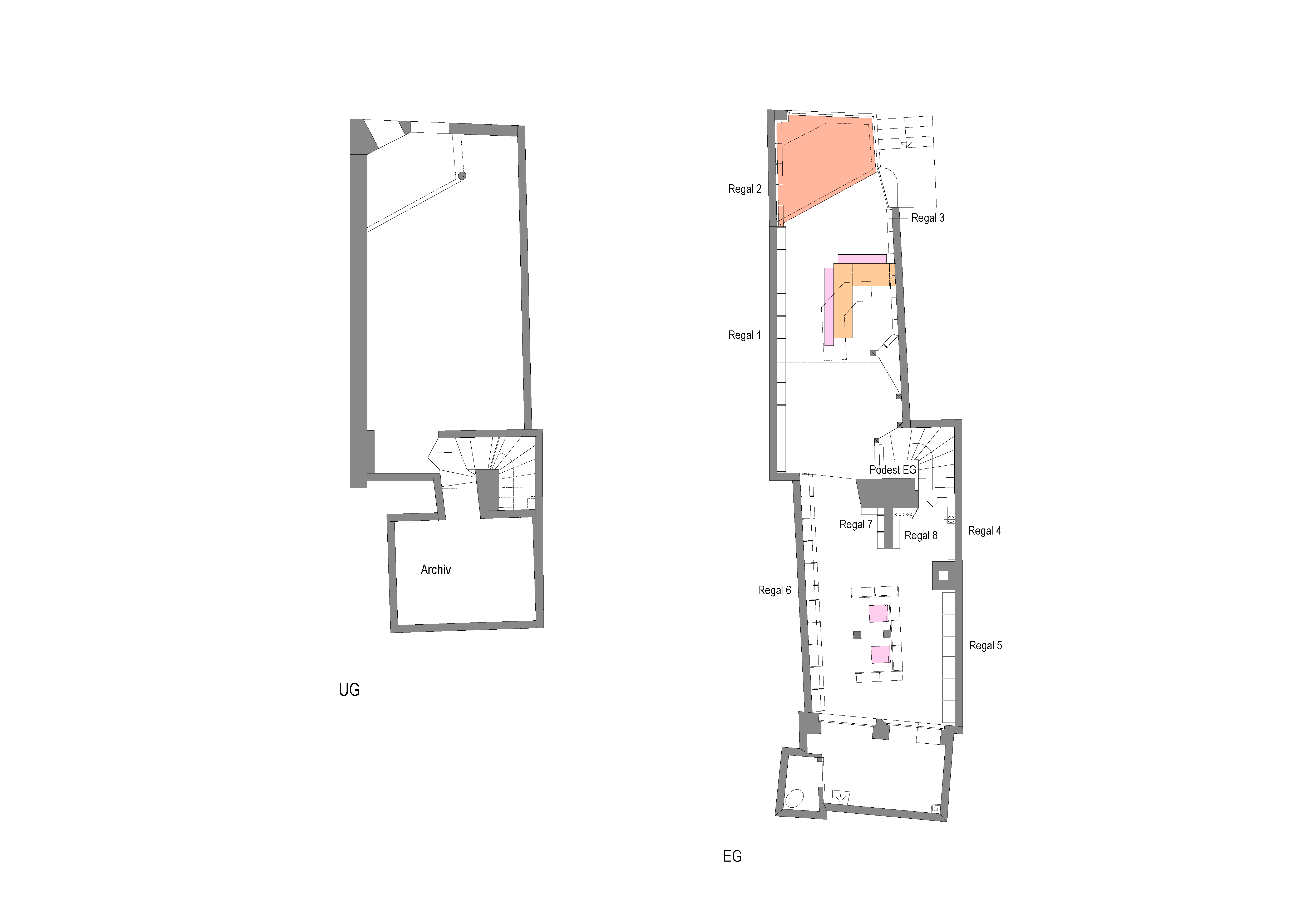 Alte historische Bruchsteinwände geben die Orientierung für die Regale vor. Der Boden wurde mit Linoleum ausgestattet.