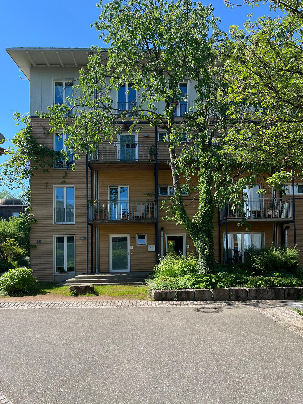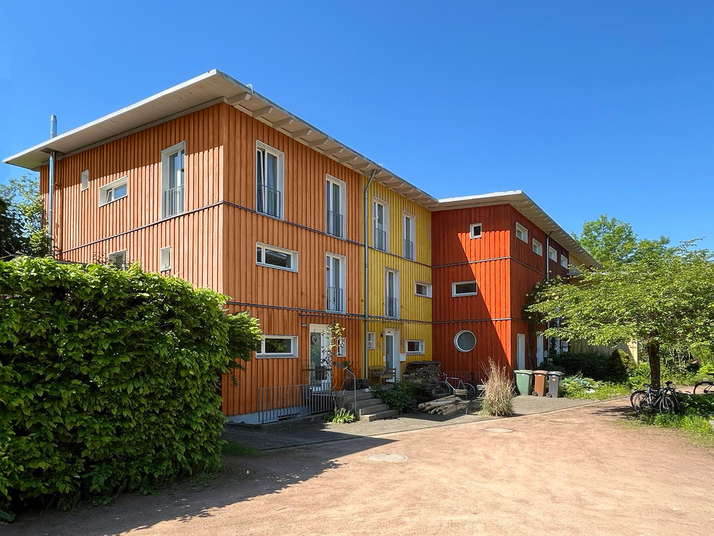 Der im Jahre 1997 noch unübliche Anspruch, in Passivhausbauweise und 4 geschossigem Holzbau zu bauen, konnte verwirklicht werden: